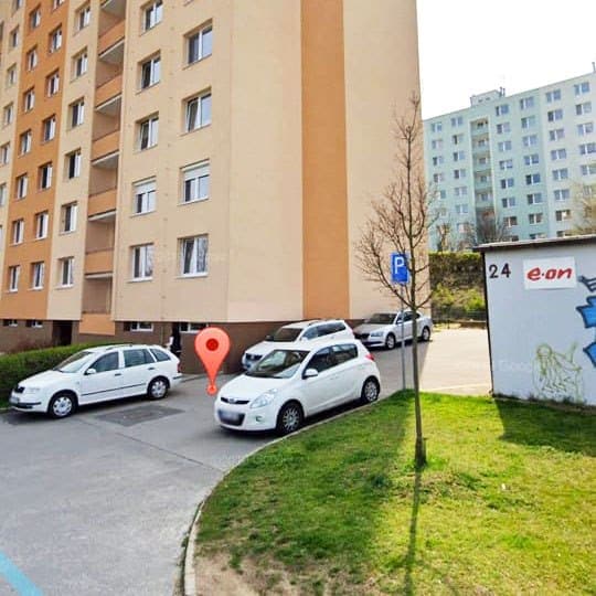 A potom: Jakmile vystoupíš z autobusu, přejdeš přes přechod na protější stranu silnice a vydáš se směrem do kopce. První panelák na rohu (na kopci) je Teyschlova 1.